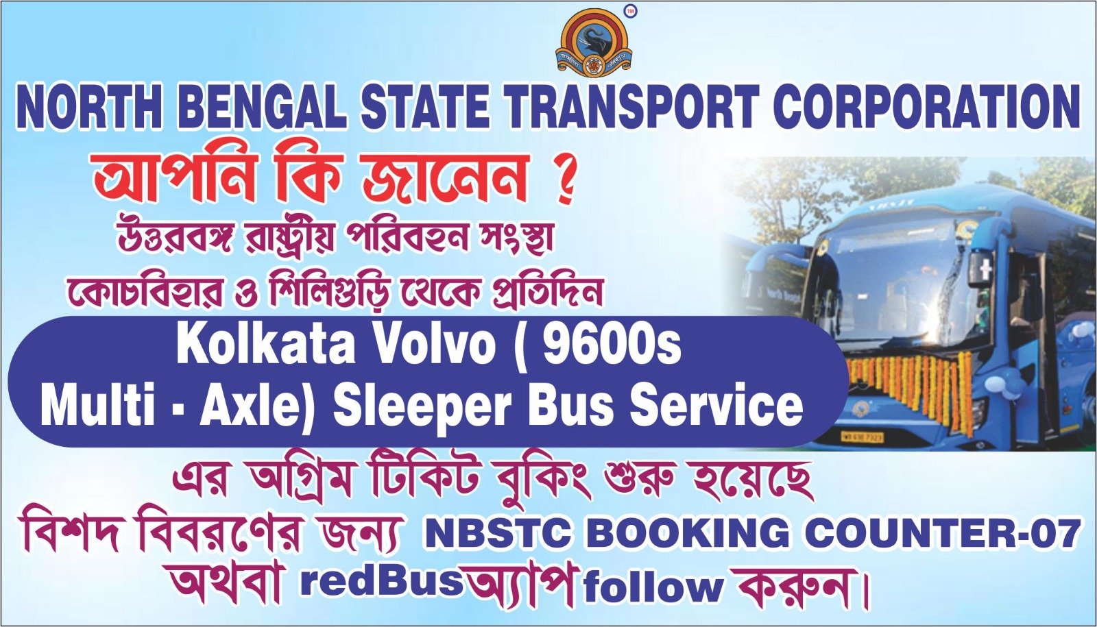 North Bengal State Transport Corporation ,by type of its operation is a District type muffussil service and its sole aim is to render services for the socio-economic development of the remote rural areas mainly in North Bengal .Unluckily, the corporation ,prior to may-2011,was diverted from this target and some services / routes towards remote areas were kept suspended on the plea of un-economic operation but the present scenario, from may-2011 and onwards, does not support the above cause on the basis of traffic demand/earnings. Similarly, such type of services under other depots of the Corporation are expected to be re-opened/newly opened shortly with overcoming the acute financial crisis facing at present and